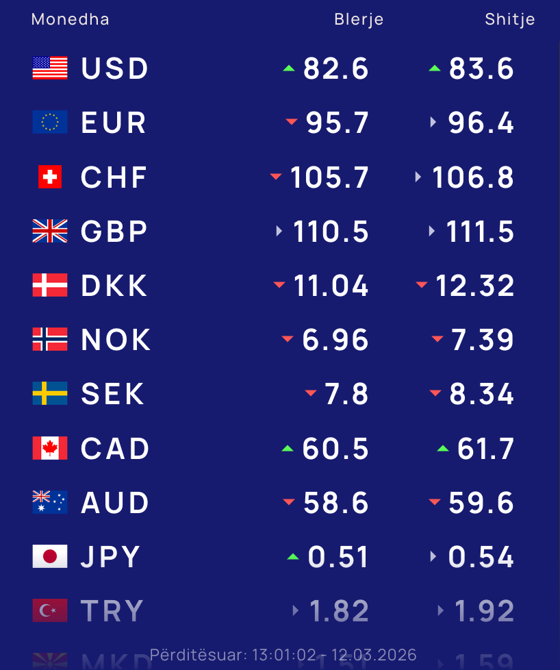 Ndërsa paundi britanik do blihet me 110.5 lekë dhe do shitet me 111.5 lekë.
