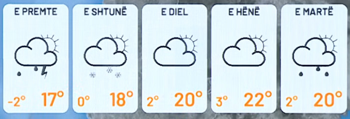 Temperaturat në fillim qëndrojnë të larta, me maksimum deri në 22°C, por kjo nuk zgjat. Nga e premtja dhe e shtuna vjen një rënie e fortë e temperaturave, duke sjellë kushte tipike dimri. Në zonat malore rikthehet dëbora, ndërsa në ultësirë dominojnë reshjet e shiut në formë rrebeshi.