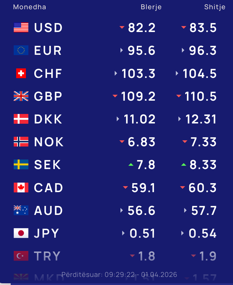 Për kursin e monedhave të tjera shihni tabelën e mëposhtme:
